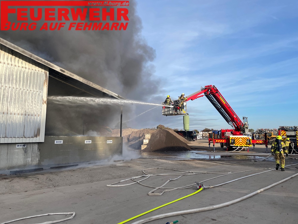 Fehmarn — Am Montag, dem 20. Oktober 2025, brach gegen 09:29 Uhr auf dem Betriebsgelände einer Recyclingfirma in Puttgarden ein Großfeuer aus. Die Feuerwehren Puttgarden-Todendorf, Vadersdorf-Gammendorf, Burg auf Fehmarn mit dem Teleskopgelenkmast und die Hauptamtliche Wache der Feuerwehr Fehmarn wurden daraufhin mit dem Einsatzstichwort FEU G 00 (Feuer größer Standard – Lagerhalle brennt) in die Straße Westerdor alarmiert. Aufgrund der raschen Ausbreitung und einer von der HaWa aus sichtbaren, dunklen, Rauchentwicklung wurde das Einsatzstichwort nach knapp drei Minuten bereits auf FEU 3 (Feuer, 3 Löschzüge) erhöht und damit auch die FF Bannesdorf hinzugezogen.