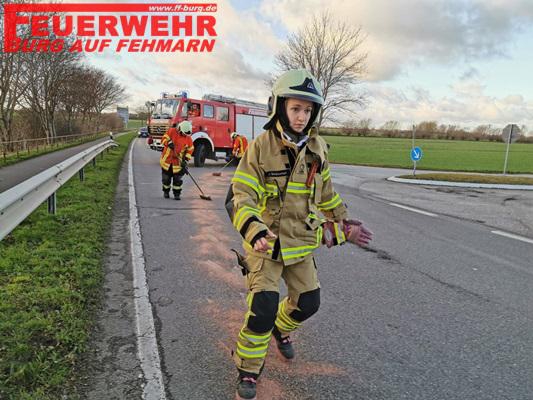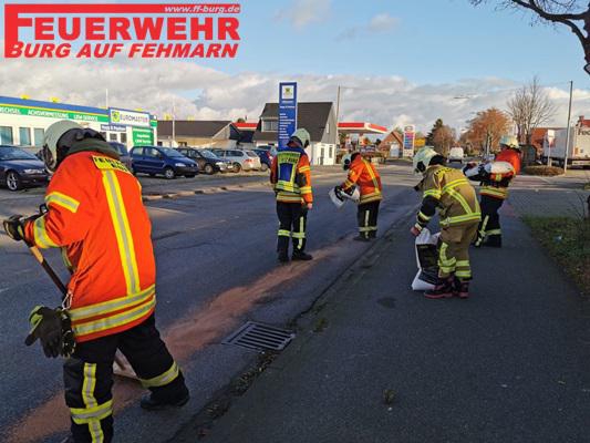 Das HLF übernahm den "Erstangriff" im Landkirchener Weg, wo der Transporter parkte. Hier wurde die Dieselspur im Kreuzungsbereich des Hofes abgestreut. Die Gruppe vom LF 16/12 streute den gesamten Landkirchener Weg ab Tankstelle bis zum besagten Scan-Shop ab. Im Anschluss wurde die Auffahrt der B207 / E47 erkundet, weil der Schwede diese Strecke zuvor befuhr. Es wurden dann noch der Kreuzungsbereich B207 - L209 (Landkirchen > Burg) und im Bereich des Kreisels des Landkirchener Weg abgestreut.