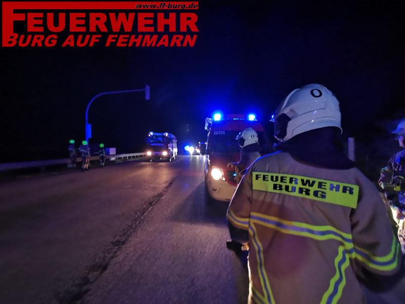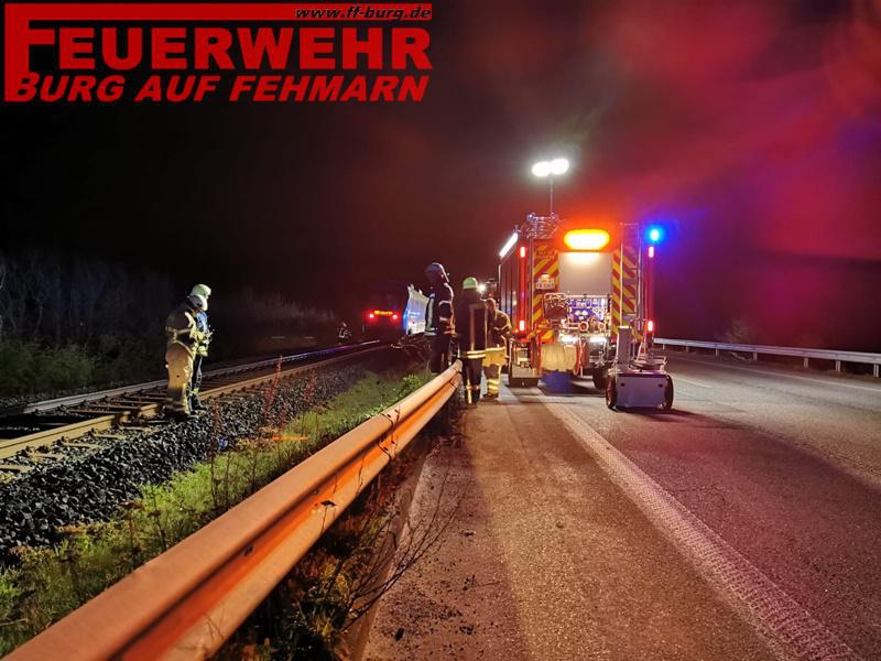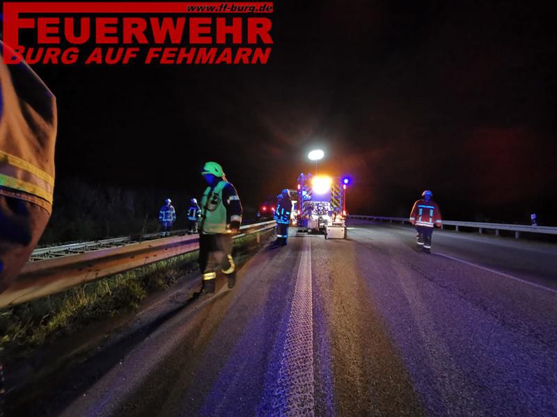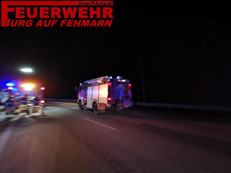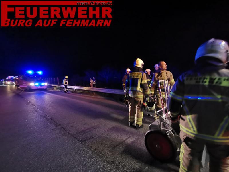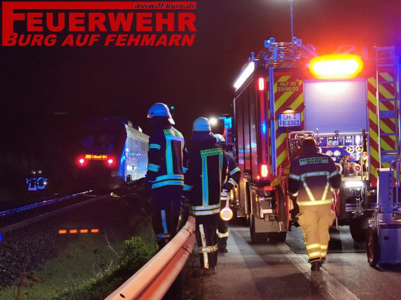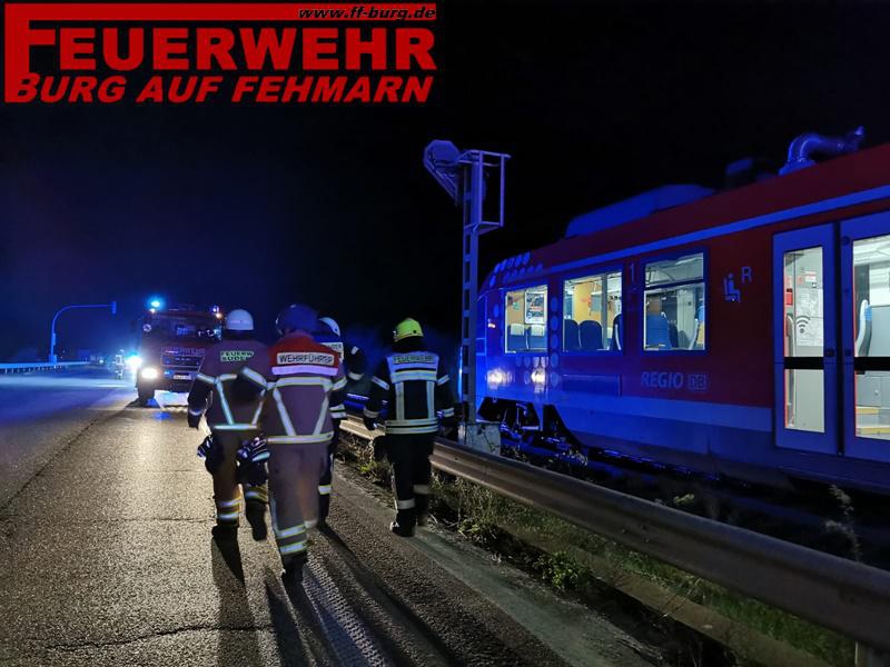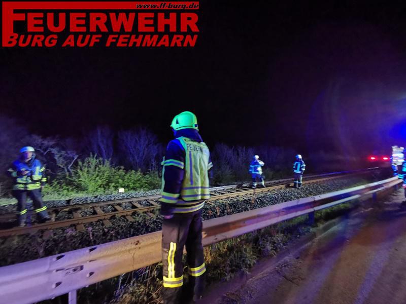Die Lage stellte sich wie folgt heraus: Die Regionalbahn 85 (Richtung Lübeck unterwegs) überfuhr trotz Vollbremsung einen Rehbock und riss sich dadurch die Ölwanne auf und es traten rund 80 Liter Öl auf die Gleise/ins Gleisbett aus. Im Zug befanden sich zum Unfallzeitpunkt ein Fahrgast, ein Zugbegleiter und der Lokführer - alle blieben unverletzt. Die Fehmarnsundbrücke musste kurzzeitig für den gesamten Verkehr gesperrt werden. Für uns 33er Kräfte beschränkte sich die Tätigkeit auf das Ausleuchten der Einsatzstelle.