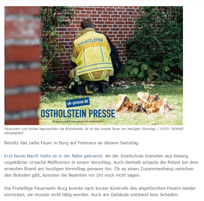 Die Meldenden organisierten zeitgleich Wasser und konnten den kleinen Schwelbrand bereits vor Eintreffen der Feuerwehr ablöschen. Wie sich die losen Holzreste eines gefällten Baumes im Gebüsch am Haus entzündeten ist nicht klar. Die Polizei ermittelt.