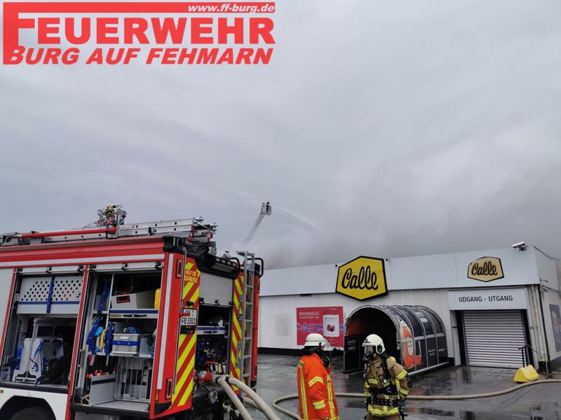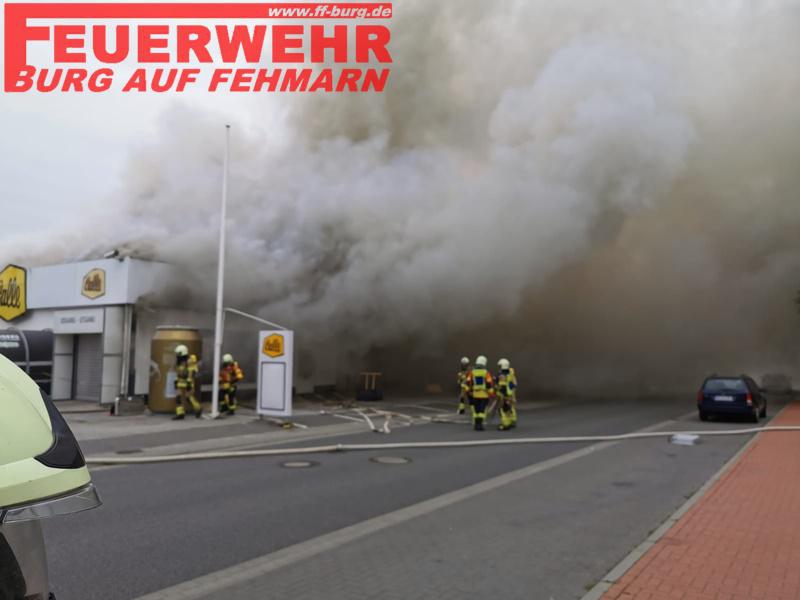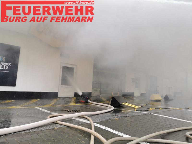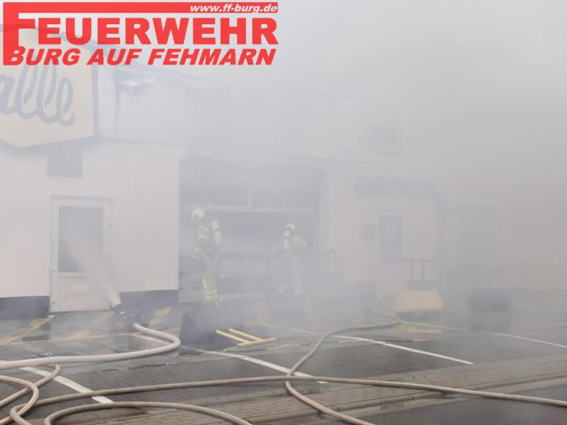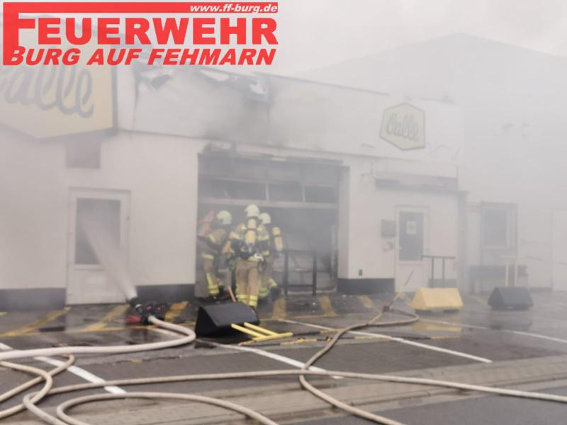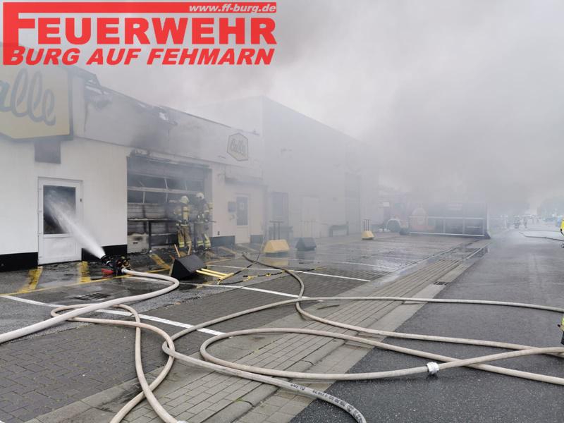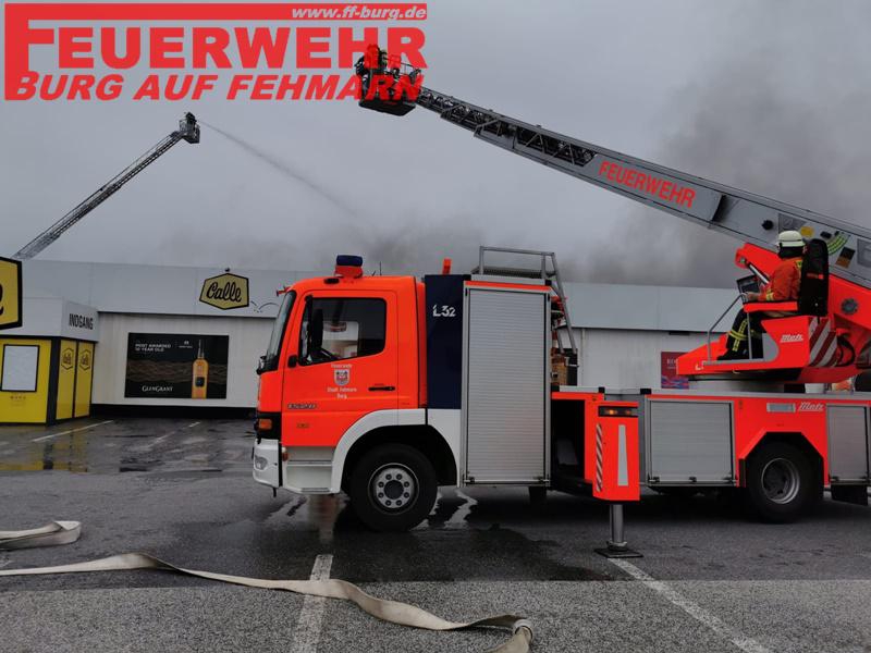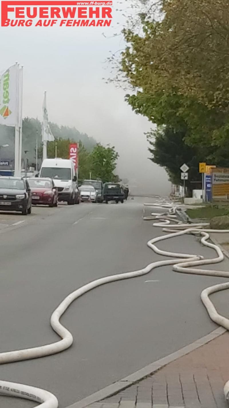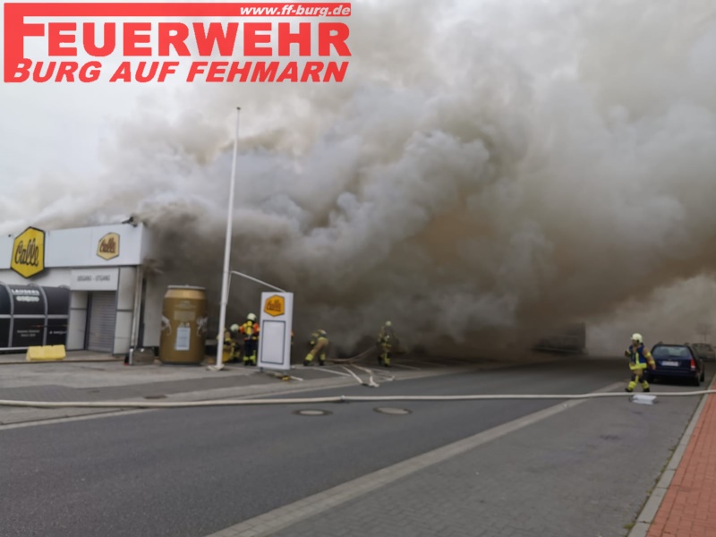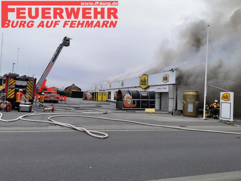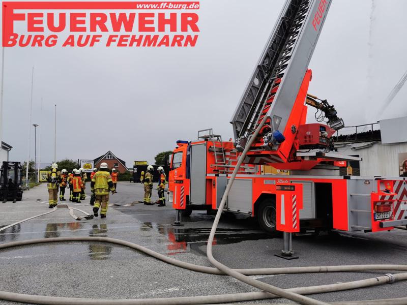 Bereits auf der Anfahrt war eine große Rauchsäule über dem Gewerbegebiet sichtbar. Am Einsatzort schlugen bereits Flammen aus der Gebäudewand, die gesamte Ladenverkaufshalle qualmte pechschwarz. Das von uns ersteintreffende LF 8/6 baute unverzüglich eine Wasserversorgung vom Hydranten der Gegenüberliegenden Straßenseite auf. Das HLF und die Drehleiter bauten unverzüglich einen Erstangriff auf dem Kundenparkplatz auf. Direkt gingen die ersten Atemschutztrupps in das Gebäude. Der gesamte umliegende Bereich in der Industriestraße wurde vorsorglich evakuiert. Die Strom- und Gasversorgung des betroffenen Gebäudes wurde getrennt. Das nachgerückte LF 16/12 fuhr gleich bis zum nächsten Löschteich durch, von dort wurde eine Wasserversorgung über lange Wegstrecke aufgebaut, die Besatzung des Burger LF 16-TS baute eine weitere Leitung von dort auf. Bereits in der Anfangsphase des Einsatzes wurde eine weitere Drehleiter aus Heiligenhafen angefordert. Die Landkirchener Kameraden stellten eine Riegelstellung im hinteren Gebäudebereich auf, um ein Übergreifen der Flammen auf u.a. ein Gaslager zu verhindern. Desweiteren wurde die Wasserversorgung auch vom "Ehlers-Kamp" über den Löschwasserteich gefahren, wodurch später auch die 35er Drehleiter gespeist wurde.