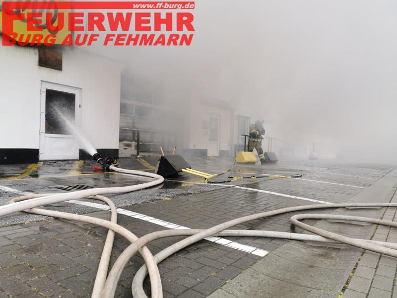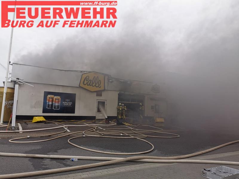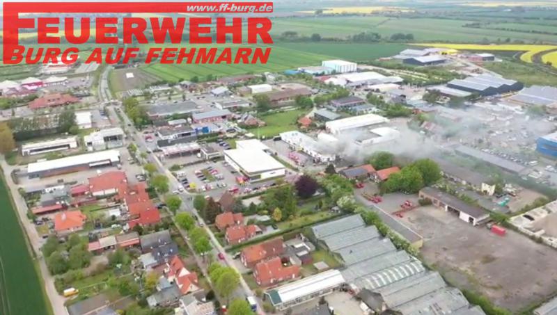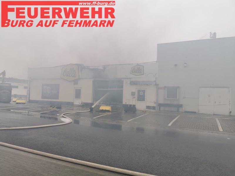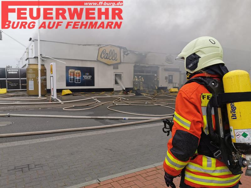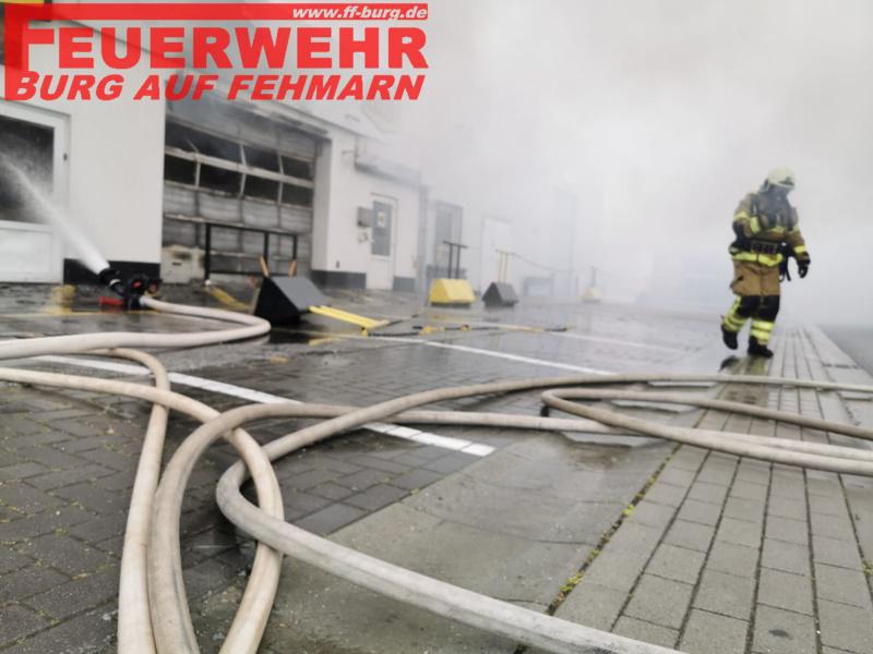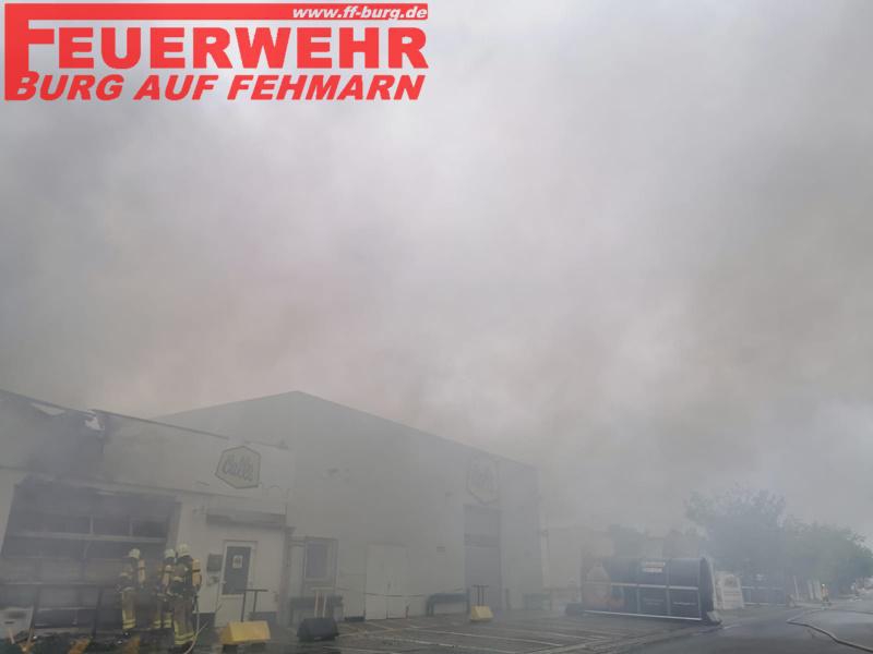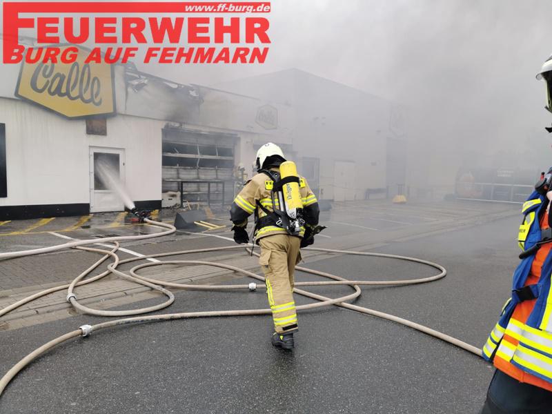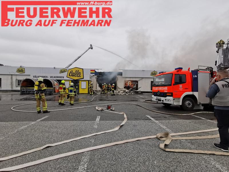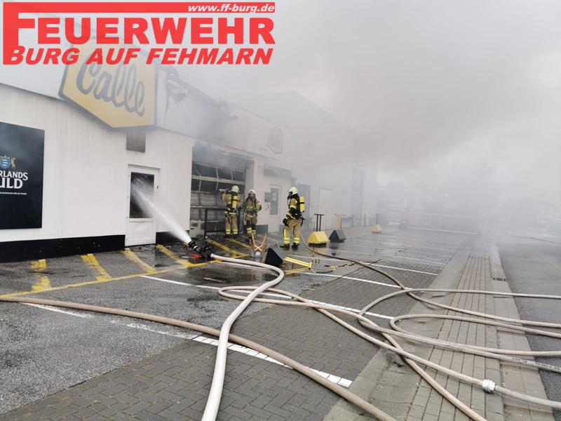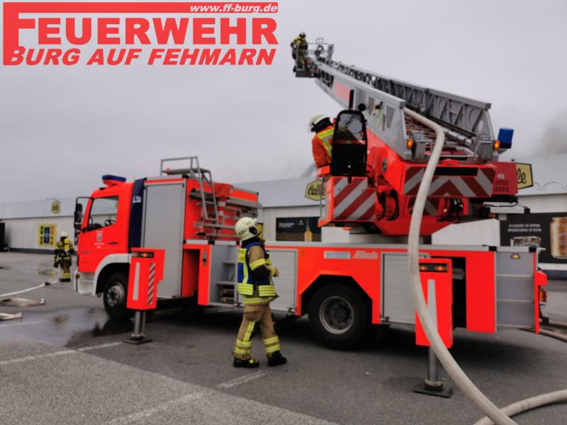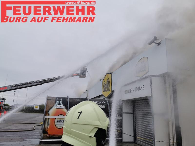 Bereits auf der Anfahrt war eine große Rauchsäule über dem Gewerbegebiet sichtbar. Am Einsatzort schlugen bereits Flammen aus der Gebäudewand, die gesamte Ladenverkaufshalle qualmte pechschwarz. Das von uns ersteintreffende LF 8/6 baute unverzüglich eine Wasserversorgung vom Hydranten der Gegenüberliegenden Straßenseite auf. Das HLF und die Drehleiter bauten unverzüglich einen Erstangriff auf dem Kundenparkplatz auf. Direkt gingen die ersten Atemschutztrupps in das Gebäude. Der gesamte umliegende Bereich in der Industriestraße wurde vorsorglich evakuiert. Die Strom- und Gasversorgung des betroffenen Gebäudes wurde getrennt. Das nachgerückte LF 16/12 fuhr gleich bis zum nächsten Löschteich durch, von dort wurde eine Wasserversorgung über lange Wegstrecke aufgebaut, die Besatzung des Burger LF 16-TS baute eine weitere Leitung von dort auf. Bereits in der Anfangsphase des Einsatzes wurde eine weitere Drehleiter aus Heiligenhafen angefordert. Die Landkirchener Kameraden stellten eine Riegelstellung im hinteren Gebäudebereich auf, um ein Übergreifen der Flammen auf u.a. ein Gaslager zu verhindern. Desweiteren wurde die Wasserversorgung auch vom "Ehlers-Kamp" über den Löschwasserteich gefahren, wodurch später auch die 35er Drehleiter gespeist wurde.