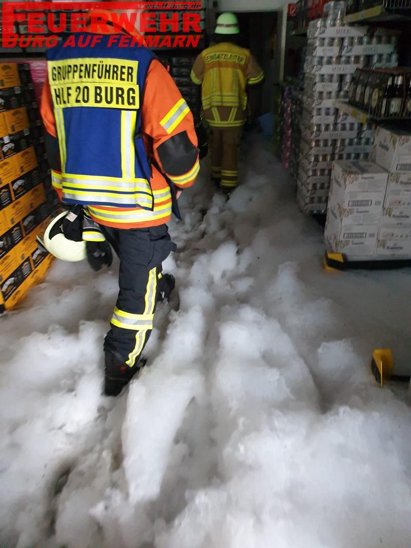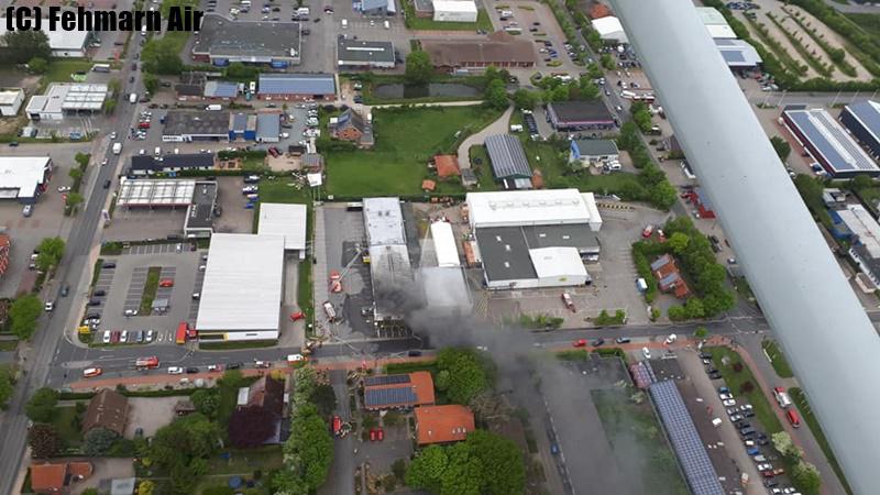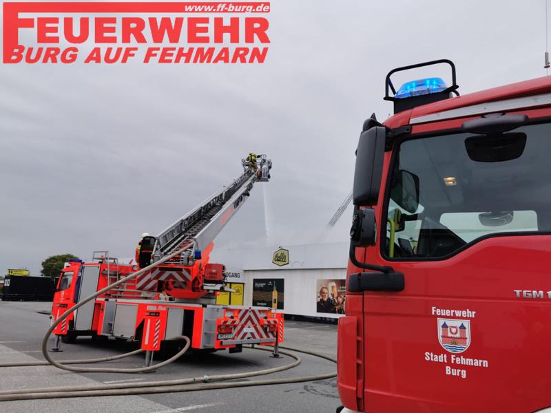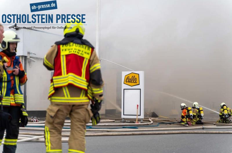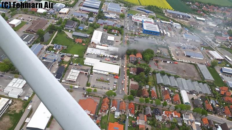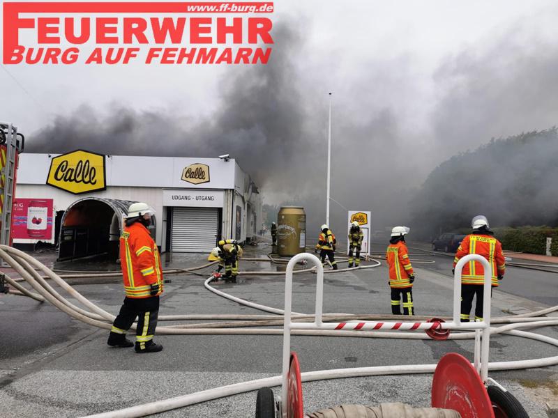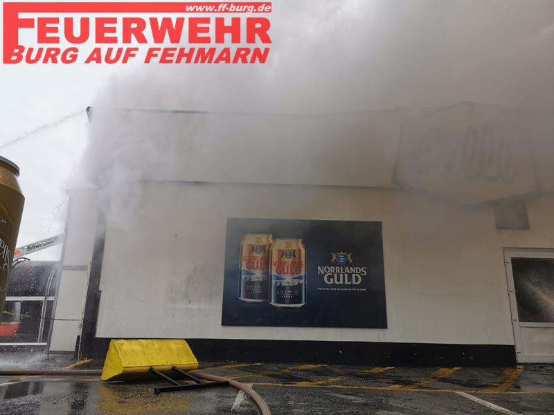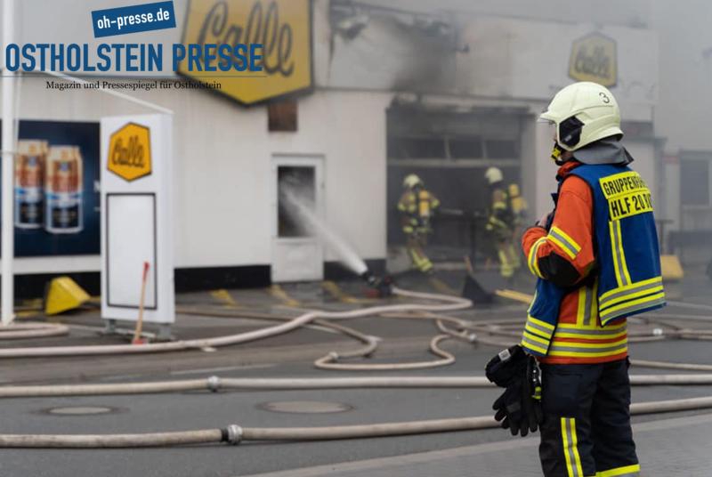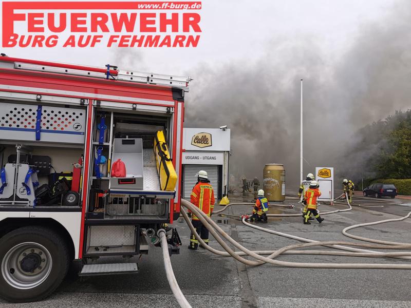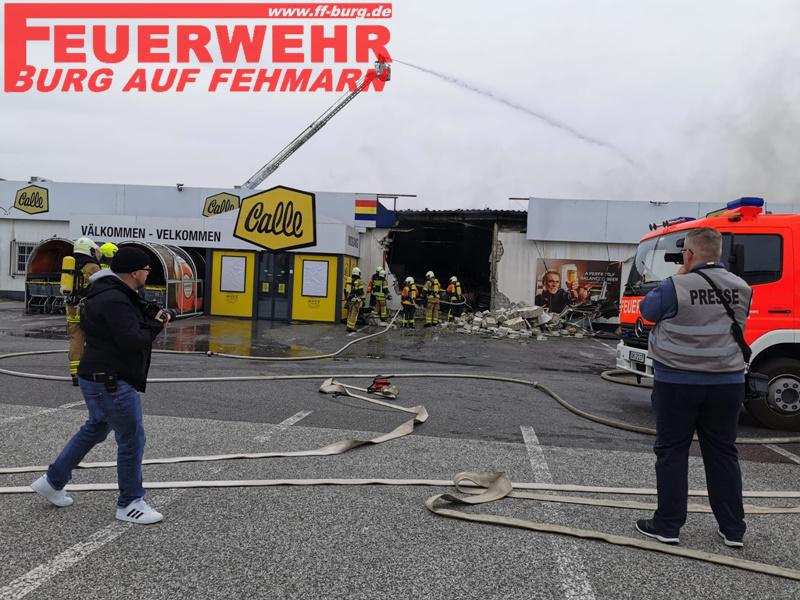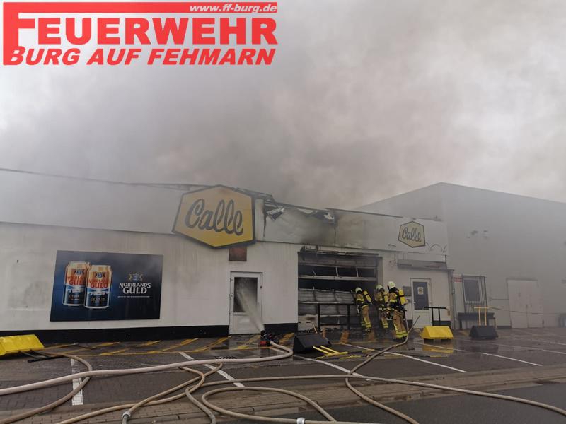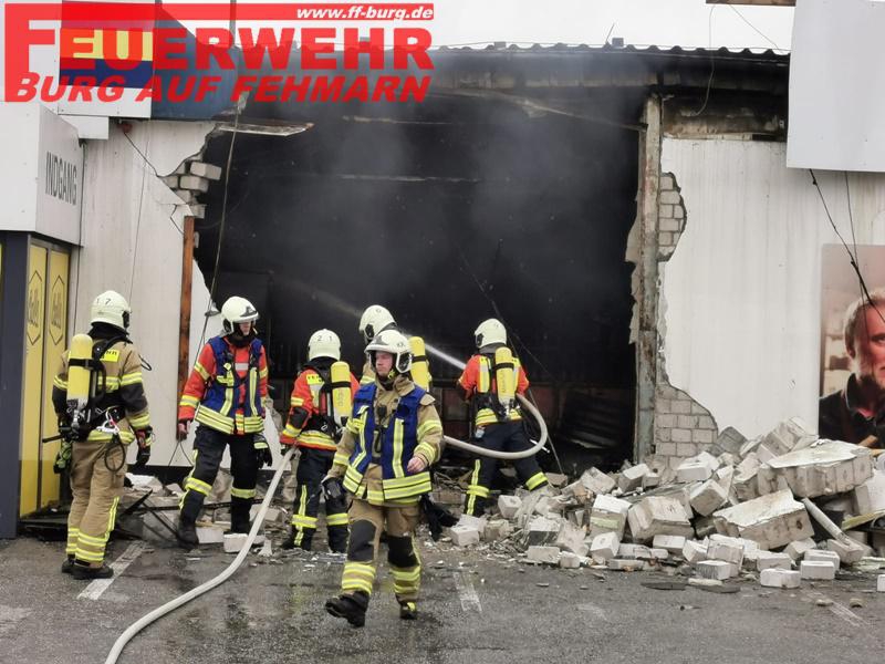 Bereits auf der Anfahrt war eine große Rauchsäule über dem Gewerbegebiet sichtbar. Am Einsatzort schlugen bereits Flammen aus der Gebäudewand, die gesamte Ladenverkaufshalle qualmte pechschwarz. Das von uns ersteintreffende LF 8/6 baute unverzüglich eine Wasserversorgung vom Hydranten der Gegenüberliegenden Straßenseite auf. Das HLF und die Drehleiter bauten unverzüglich einen Erstangriff auf dem Kundenparkplatz auf. Direkt gingen die ersten Atemschutztrupps in das Gebäude. Der gesamte umliegende Bereich in der Industriestraße wurde vorsorglich evakuiert. Die Strom- und Gasversorgung des betroffenen Gebäudes wurde getrennt. Das nachgerückte LF 16/12 fuhr gleich bis zum nächsten Löschteich durch, von dort wurde eine Wasserversorgung über lange Wegstrecke aufgebaut, die Besatzung des Burger LF 16-TS baute eine weitere Leitung von dort auf. Bereits in der Anfangsphase des Einsatzes wurde eine weitere Drehleiter aus Heiligenhafen angefordert. Die Landkirchener Kameraden stellten eine Riegelstellung im hinteren Gebäudebereich auf, um ein Übergreifen der Flammen auf u.a. ein Gaslager zu verhindern. Desweiteren wurde die Wasserversorgung auch vom "Ehlers-Kamp" über den Löschwasserteich gefahren, wodurch später auch die 35er Drehleiter gespeist wurde.