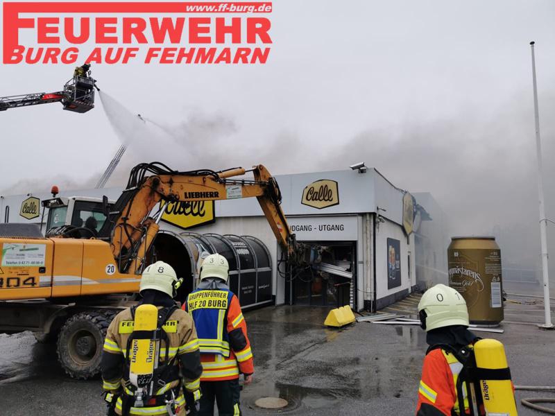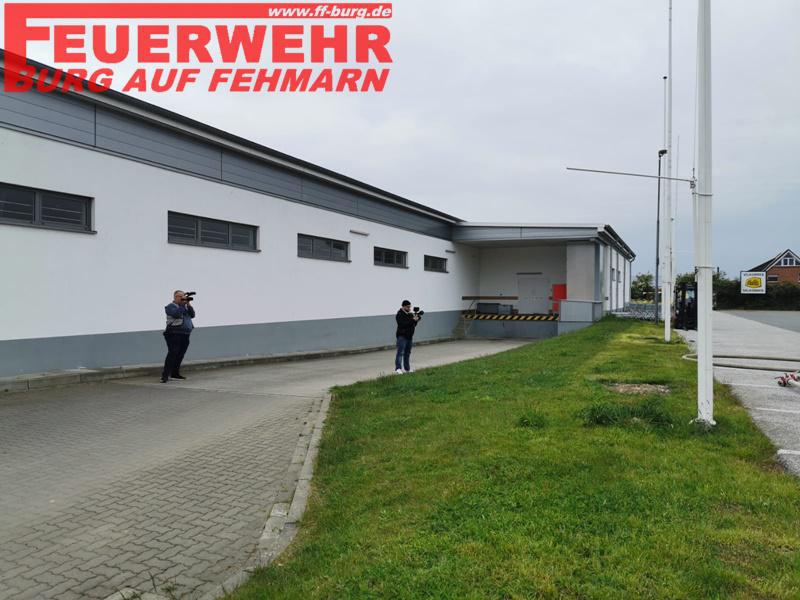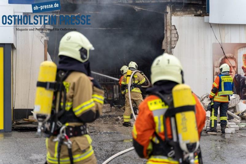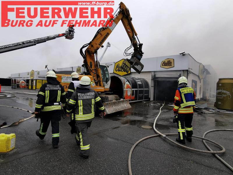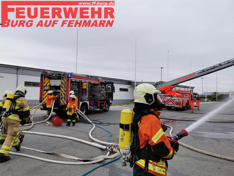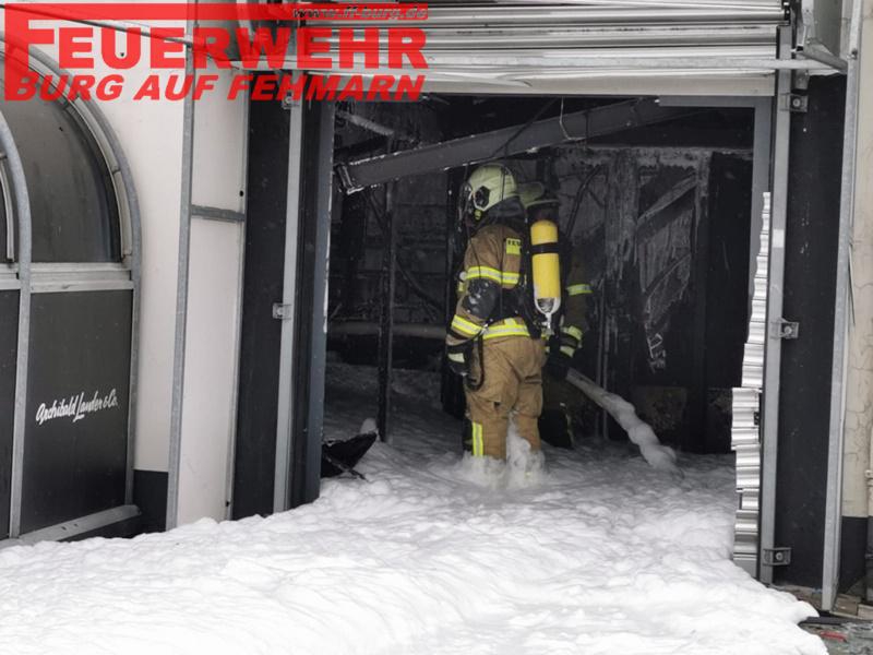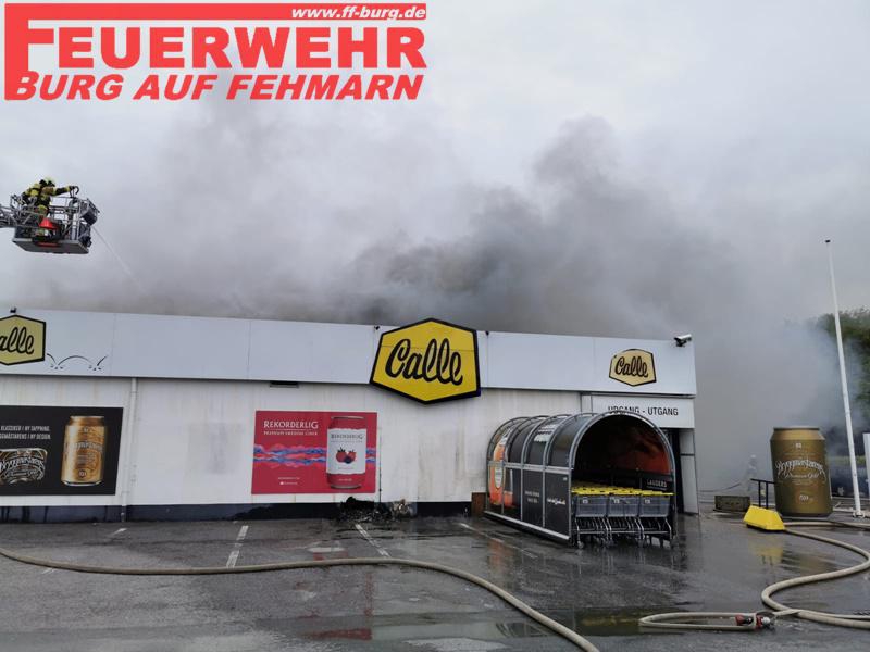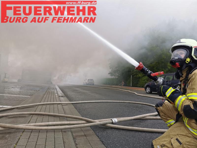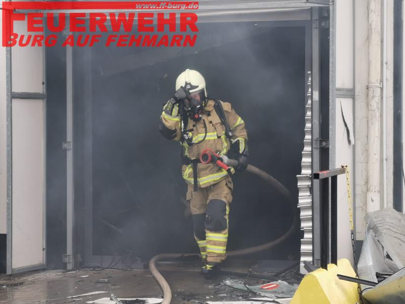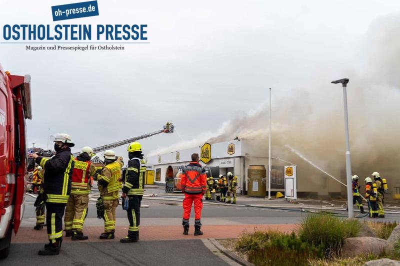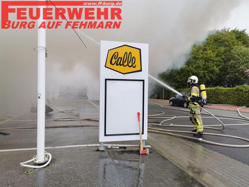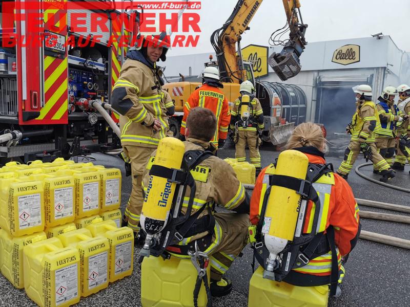 Bereits auf der Anfahrt war eine große Rauchsäule über dem Gewerbegebiet sichtbar. Am Einsatzort schlugen bereits Flammen aus der Gebäudewand, die gesamte Ladenverkaufshalle qualmte pechschwarz. Das von uns ersteintreffende LF 8/6 baute unverzüglich eine Wasserversorgung vom Hydranten der Gegenüberliegenden Straßenseite auf. Das HLF und die Drehleiter bauten unverzüglich einen Erstangriff auf dem Kundenparkplatz auf. Direkt gingen die ersten Atemschutztrupps in das Gebäude. Der gesamte umliegende Bereich in der Industriestraße wurde vorsorglich evakuiert. Die Strom- und Gasversorgung des betroffenen Gebäudes wurde getrennt. Das nachgerückte LF 16/12 fuhr gleich bis zum nächsten Löschteich durch, von dort wurde eine Wasserversorgung über lange Wegstrecke aufgebaut, die Besatzung des Burger LF 16-TS baute eine weitere Leitung von dort auf. Bereits in der Anfangsphase des Einsatzes wurde eine weitere Drehleiter aus Heiligenhafen angefordert. Die Landkirchener Kameraden stellten eine Riegelstellung im hinteren Gebäudebereich auf, um ein Übergreifen der Flammen auf u.a. ein Gaslager zu verhindern. Desweiteren wurde die Wasserversorgung auch vom "Ehlers-Kamp" über den Löschwasserteich gefahren, wodurch später auch die 35er Drehleiter gespeist wurde.