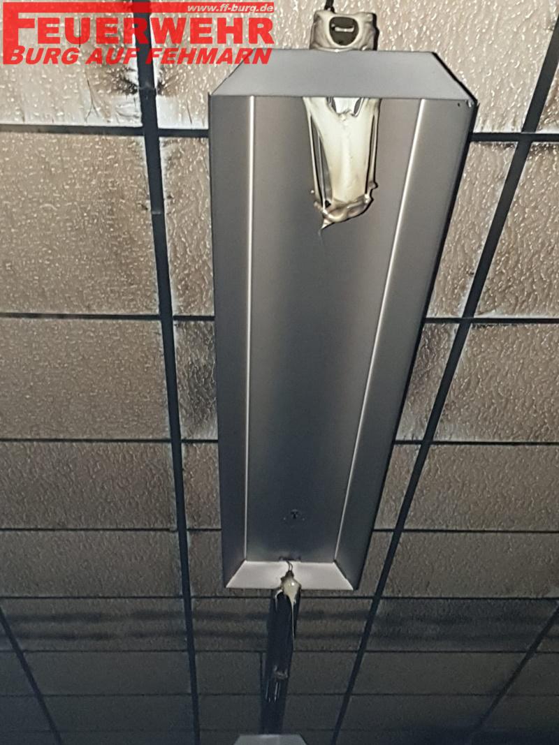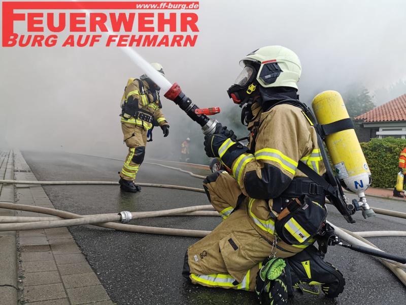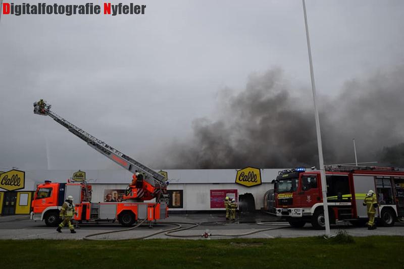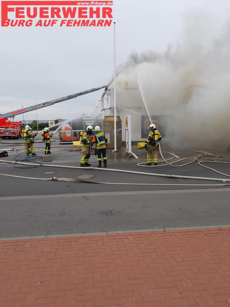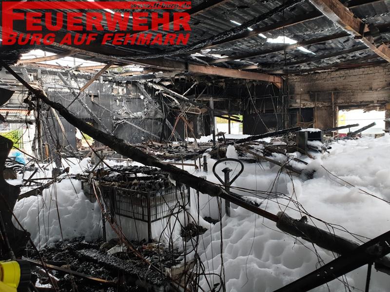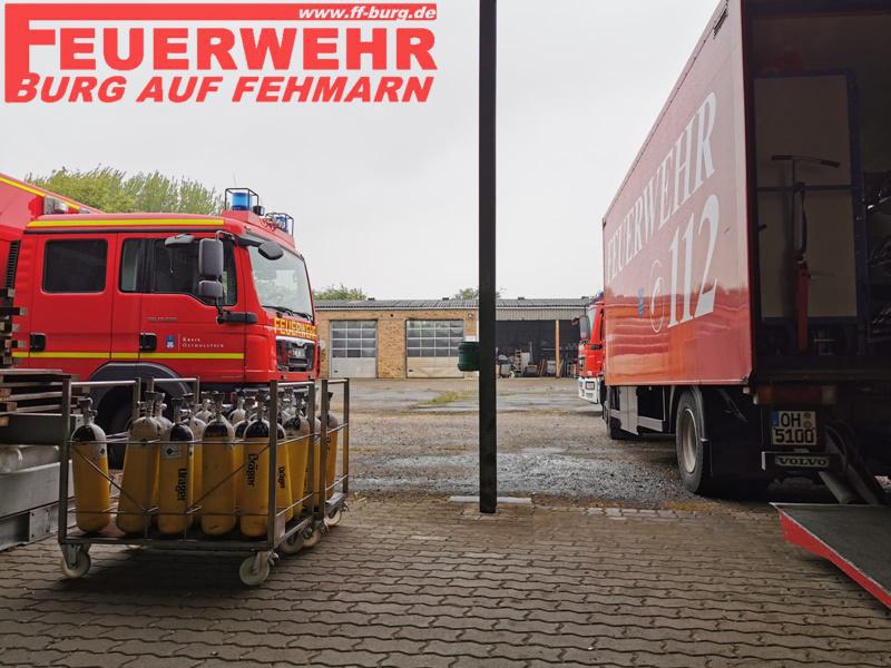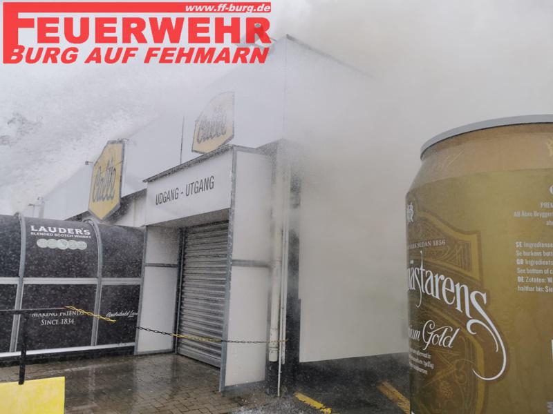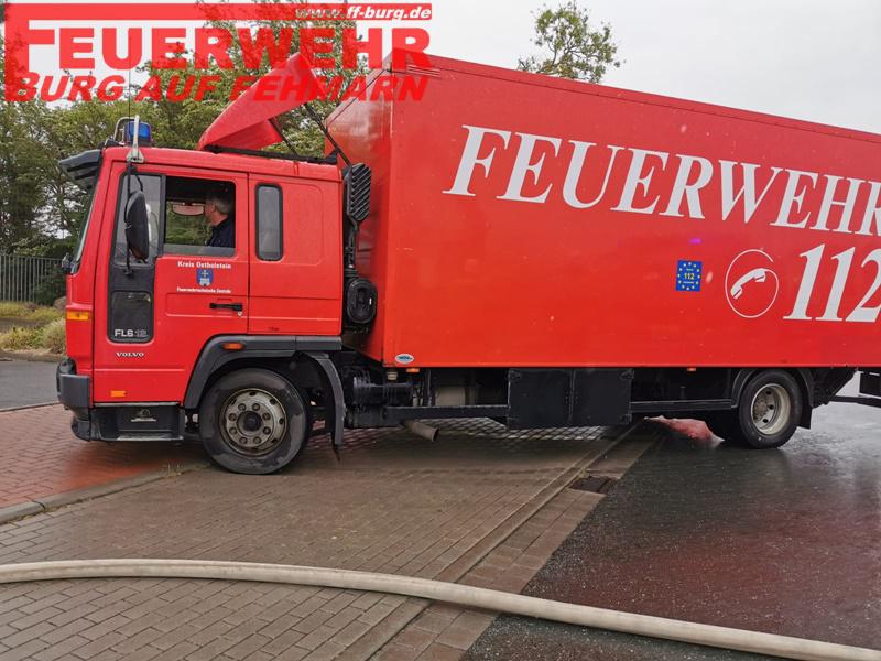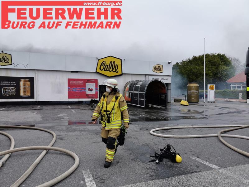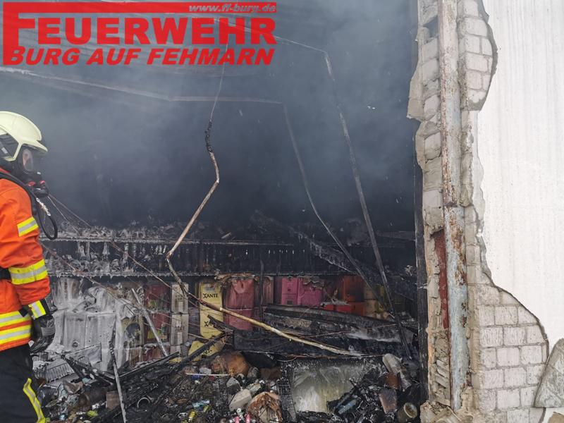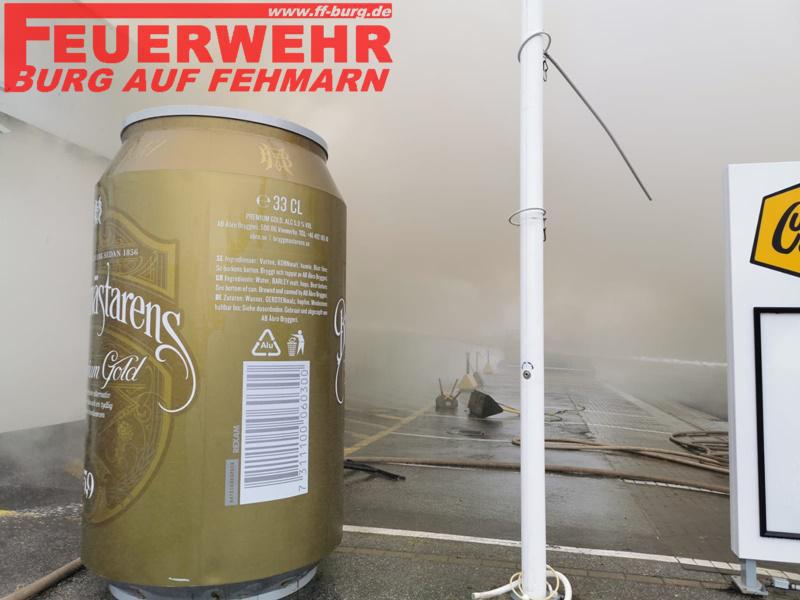 Bereits auf der Anfahrt war eine große Rauchsäule über dem Gewerbegebiet sichtbar. Am Einsatzort schlugen bereits Flammen aus der Gebäudewand, die gesamte Ladenverkaufshalle qualmte pechschwarz. Das von uns ersteintreffende LF 8/6 baute unverzüglich eine Wasserversorgung vom Hydranten der Gegenüberliegenden Straßenseite auf. Das HLF und die Drehleiter bauten unverzüglich einen Erstangriff auf dem Kundenparkplatz auf. Direkt gingen die ersten Atemschutztrupps in das Gebäude. Der gesamte umliegende Bereich in der Industriestraße wurde vorsorglich evakuiert. Die Strom- und Gasversorgung des betroffenen Gebäudes wurde getrennt. Das nachgerückte LF 16/12 fuhr gleich bis zum nächsten Löschteich durch, von dort wurde eine Wasserversorgung über lange Wegstrecke aufgebaut, die Besatzung des Burger LF 16-TS baute eine weitere Leitung von dort auf. Bereits in der Anfangsphase des Einsatzes wurde eine weitere Drehleiter aus Heiligenhafen angefordert. Die Landkirchener Kameraden stellten eine Riegelstellung im hinteren Gebäudebereich auf, um ein Übergreifen der Flammen auf u.a. ein Gaslager zu verhindern. Desweiteren wurde die Wasserversorgung auch vom "Ehlers-Kamp" über den Löschwasserteich gefahren, wodurch später auch die 35er Drehleiter gespeist wurde.