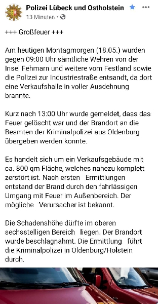 Zur Brandursache war die Kriminalpolizei vor Ort und hat auch eine Pressemitteilung herausgebracht (als Bild angehängt). Während des Einsatzes war die Industriestraße voll gesperrt. Auch in Großen Teilen des Gewerbegebietes kam es zu Verkehrsbeeinträchtigungen.