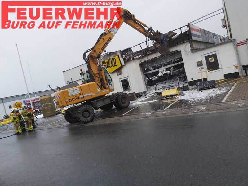 Die Einsatzleitung bestellte einen Bagger, um Teile des Gebäudes einzureißen. Hierdurch konnte der Rauch entfliehen und ein besserer Löschangriff gefahren werden. Fachberater vom Löschzug-Gefahrgut, den Stadtwerken und auch die Kreiswehrführung sowie unser Bürgermeister waren vor Ort. Im weiteren Einsatzverlauf fluteten wir den gesamten Markt mit Schaum, um möglichst alle Glutnester zu ersticken.