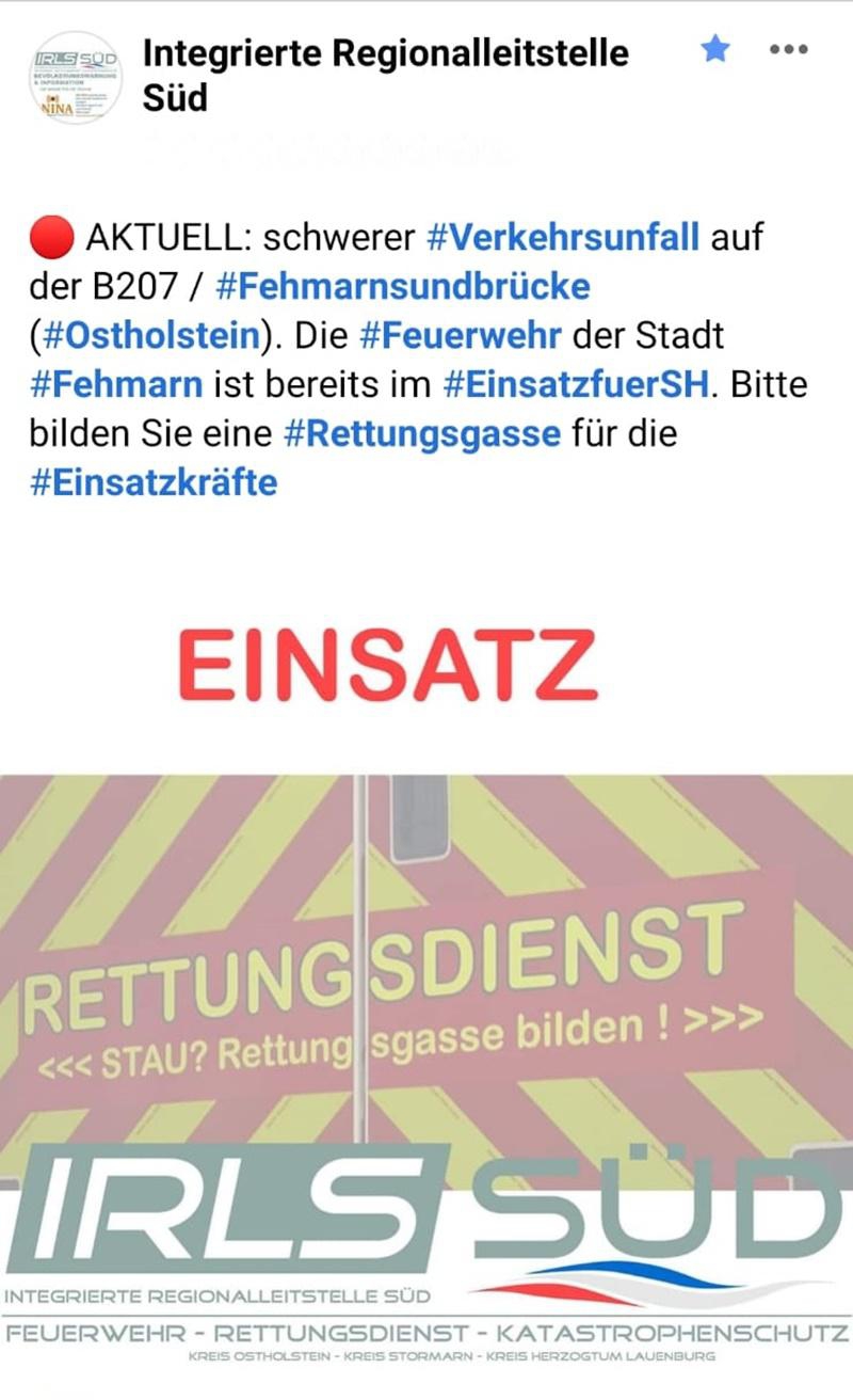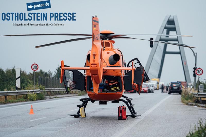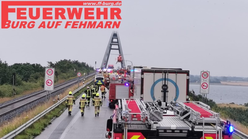 Am gestrigen Dienstagabend (14.07.) kam es auf der B207 unmittelbar an der Fehmarnsundbrücke in Fahrtrichtung Süden zu einem schweren Unfall. Ein Autofahrer wurde erheblich verletzt und mit dem Rettungshubschrauber in ein Krankenhaus geflogen. Die Fehmarnsundbrücke war über zwei Stunden in beide Fahrtrichtungen gesperrt.