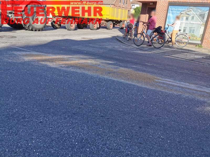 Auf der Rückfahrt vom Einsatz TH WASSER Y bemerkten wir in Höhe der Kreuzung Sahrensdorfer Str./Mathildenstraße eine Ölspur und eine Kornspur direkt mittig der Fahrbahn, sodass hier eine Gefahr z.B. für Motorradfahrer ausging. Unser stellv.OWF beuaftragte uns, diese Gefahr zu beseitigen. KdoW und MTW wurden zur Straßensperrung genutzt, Spuren beseitigt und den Verkehr wieder freigegeben. Es führte zu längeren Staus auf allen Seiten.