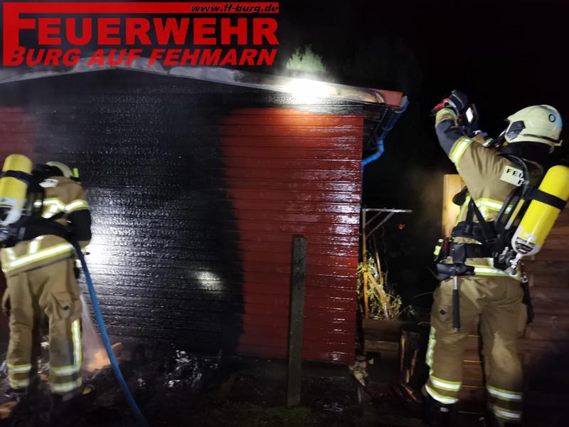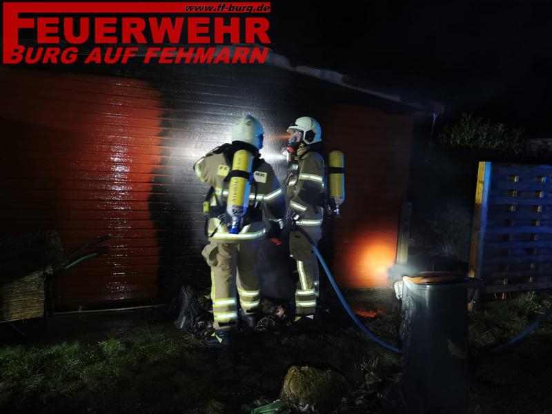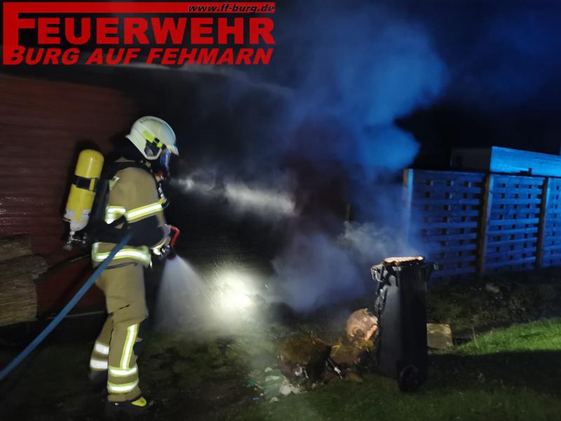 Vor Ort hatten nach Absetzen des Notrufs bereits Grundstückseigentümer und Nachbarn mit eigenen Löscharbeiten begonnen und konnten die in Brand stehenden Mülltonnen und Bewuchs an einer Gartenlaube schon weitestgehend ablöschen. Das Feuer griff von den brennenden Mülltonnen auch auf die Holzfassade der angrenzenden Gartenlaube über, konnte hier aber bis zum Eintreffen der Feuerwehr unter Kontrolle gehalten werden, lediglich die Holzwand wurde hier durch das Feuer stark beschädigt.