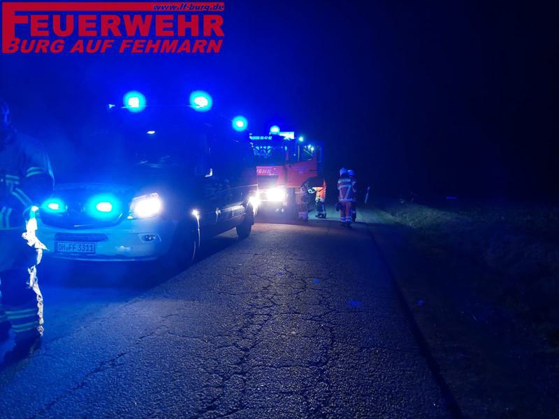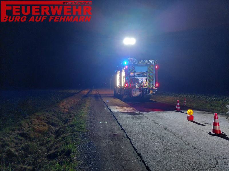 Wir sind am Halloweenabend zu einem PKW Brand auf dem Verbindungsweg Richtung Wulfen alarmiert worden. Vor Ort wurden wir durch die POL und den RD in die Lage eingewiesen. Ein PKW lag auf der Seite am Graben, die Person war bereits raus und wurde vom Rettungsdienst versorgt. Wir wurden alarmiert, da vermutet wurde, dass das Fahrzeug jederzeit anfängt zu brennen. Wir stellten den zweifachen Brandschutz unter Atemschutz sicher, richteten das Fahrzeug auf, klemmten die Batterie ab und führten Aufräumungsarbeiten durch. Anschließend wurden wir von der Polizei gebeten, die Einsatzstelle zu sichern (mit HLF, ELW), bis der Abschleppdienst eintrifft. Der ELvD klärte mit dem gerade eingetroffenen Abschlepper ab, ob er uns noch weiter braucht (denn wir piepten schon wieder...) - dies wurde verneint, wir rückten zum nächsten Alarm mit dem HLF und ELW von hier ab....Der rest durfte sich erneut auf den Weg zur Wache machen.