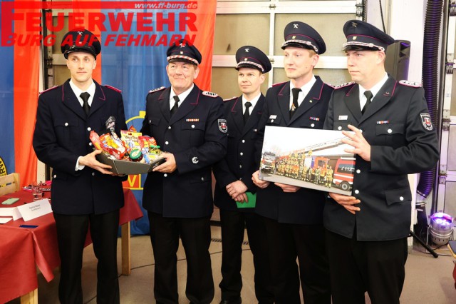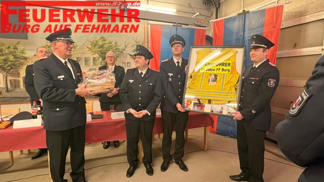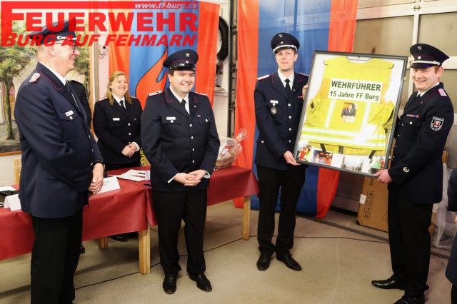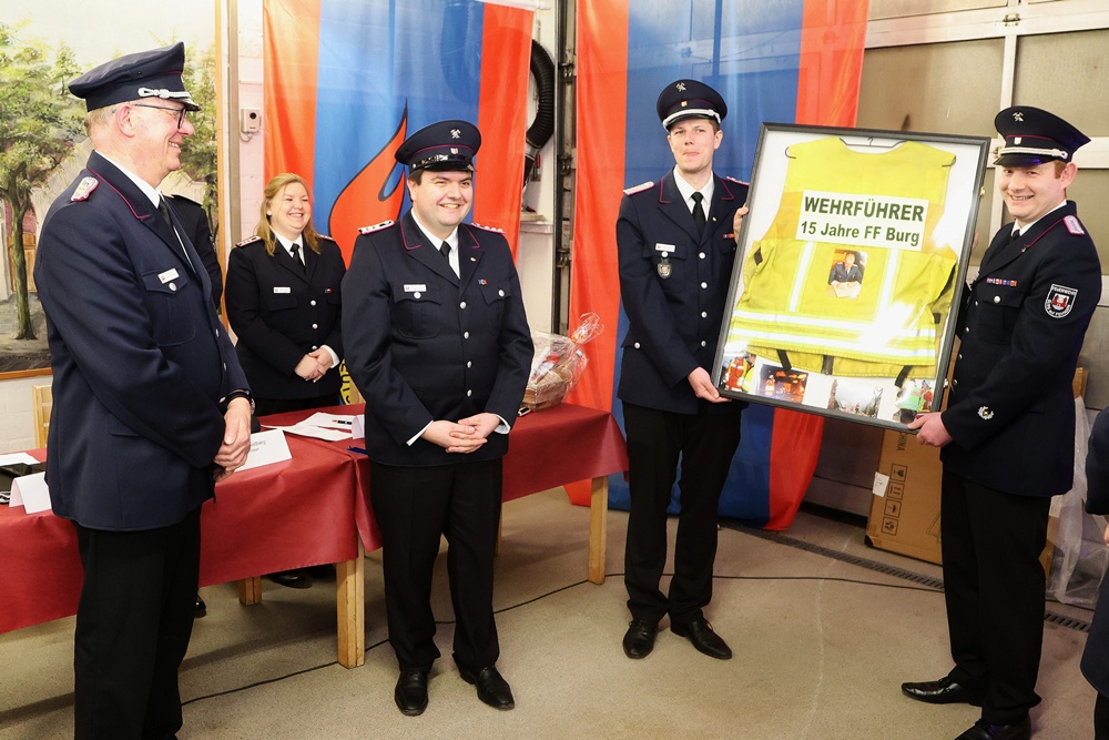 Als Andenken an insgesamt 15 Jahre an der Spitze der Burger Wehr erhielt „Fritz“ seine gelbe Einsatzleiterweste eingerahmt mit einigen Impressionen als Andenken von seiner Mannschaft überreicht.