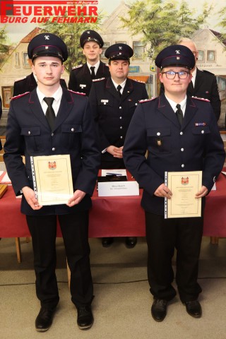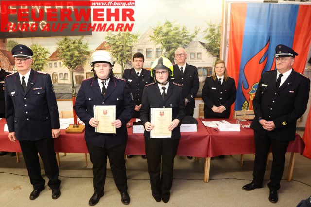 Maja Mell und Odin Sager, beide aus unserer Jugendfeuerwehr, wurden durch die Versammlung aufgenommen und im Anschluss als Feuerwehrfrau bzw. Feuerwehrmann verpflichtet und befördert. Den Dienstgrad Oberfeuerwehrmann beziehungsweise Oberfeuerwehrfrau erhielten Rene Nissen, Leo Schäfer, Max Eckhoff, Andreas Goldberg, Marcel Heun, Stefanie Koralewski, Kimi Lampe, Linus Neuffer.