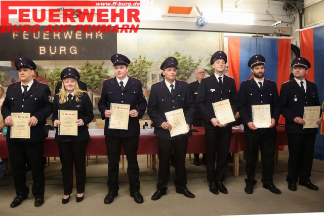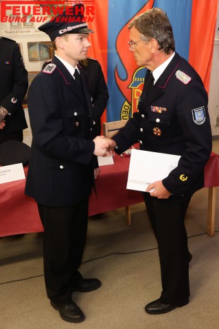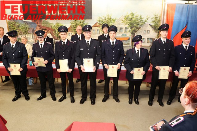 Niklas Blöß und Fabian Nissen wurden zu Hauptfeuerwehrmännern befördert. Kevin Kühl erhielt von Kreisbrandmeister Michael Hasselmann die Beförderung zum Brandmeister, nachdem er als frisch gewählter Zugführer bereits die erforderlichen Lehrgänge, darunter den Zugführerlehrgang, erfolgreich absolviert hatte. Für langjährige Mitgliedschaft wurden mehrere Kameradinnen und Kameraden ausgezeichnet. Rouven Dettlaff und Enya Sörnsen erhielten Urkunden für zehn Jahre Mitgliedschaft. Für 20 Jahre wurden Tim Franzke, Jan-Philipp Lange, David Reinke und Julian König geehrt. Hauke Nerl wurde für 30 Jahre Mitgliedschaft ausgezeichnet.