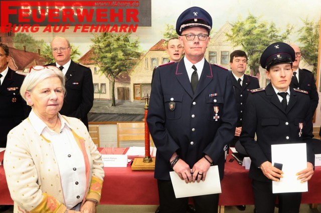 Mit dem Brandschutzehrenzeichen in Silber am Bande für 25 Jahre Dienstzeit wurden Jan Evers und Stefanie Hörnke durch die Vertreterin des Bürgermeisters, Margit Maaß, geehrt.